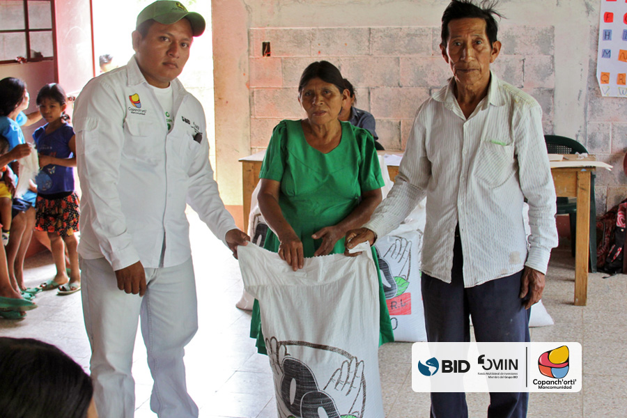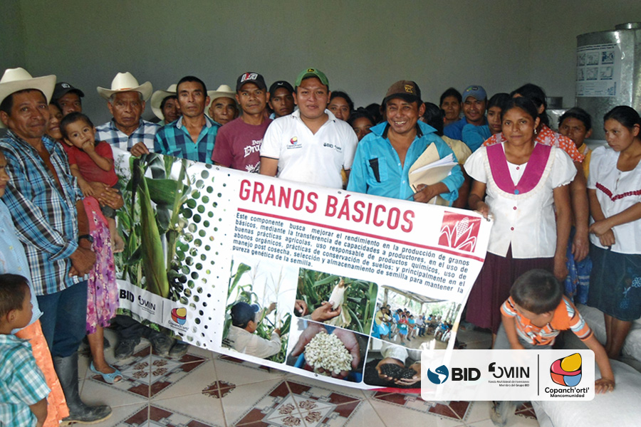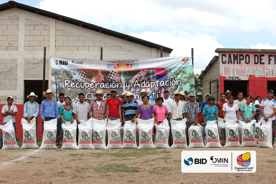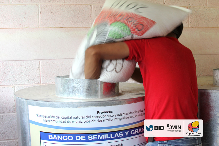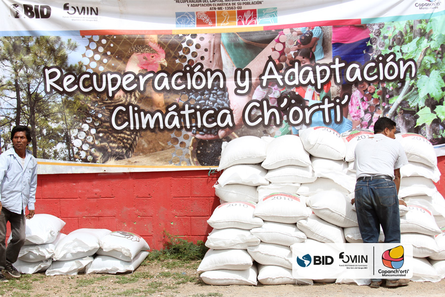 Como medida de adaptación al cambio climático en la región Ch’orti’ se realizó el fortalecimiento de los bancos comunitarios de semillas y granos, en las comunidades de Chagüitón, Dos Quebradas y Petentá, Nearar, en el municipio de Camotán, así como también en la comunidad de Canapará Abajo en el municipio de Jocotán. En la cual se entregó un lote de 60 quintales de maíz y 18 quintales de frijol, en cada una de las reservas descritas. Esta actividad se realizó dentro del marco del proyecto “Recuperación del capital natural del corredor seco y adaptación climática de su población”, ejecutado por la Mancomunidad Copanch’orti’ con fondos del BID/FOMIN, con la finalidad de contribuir en la auto-sostenibilidad de cada uno de los bancos comunitarios y sus asociados, la cual a su vez contribuye a mejorar la seguridad alimentaria de 90 familias de pequeños productores en las comunidades mencionadas.
